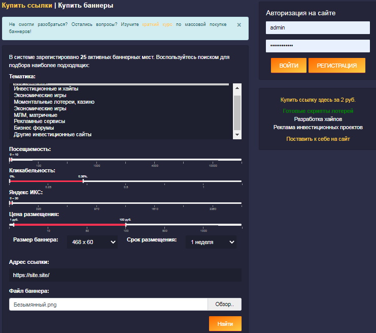 9 Срок размещения. На всех баннерных площадках системы срок размещения начинается 1 недели и не может превышать 4 недель. Этот параметр в значительной мере влияет на конечную стоимость покупки, но никак не влияет на количество найденных площадок.