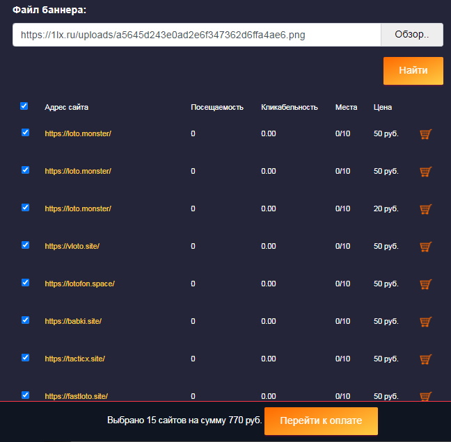 После того, как вы определились с выбором площадок, необходимо нажать на кнопку «Перейти к покупке» и выбрать способ оплаты. Все купленные баннеры будут размещены сразу же после оплаты и вы сможете отслеживать их статус в разделе «Покупки».